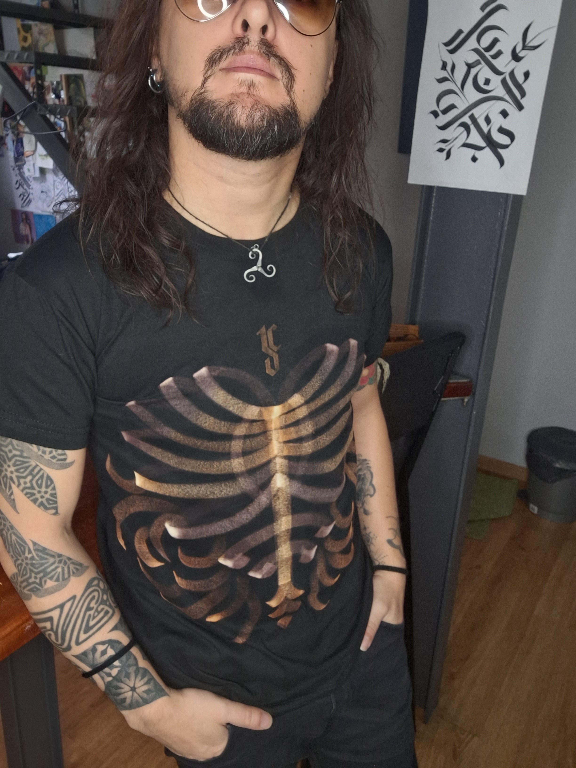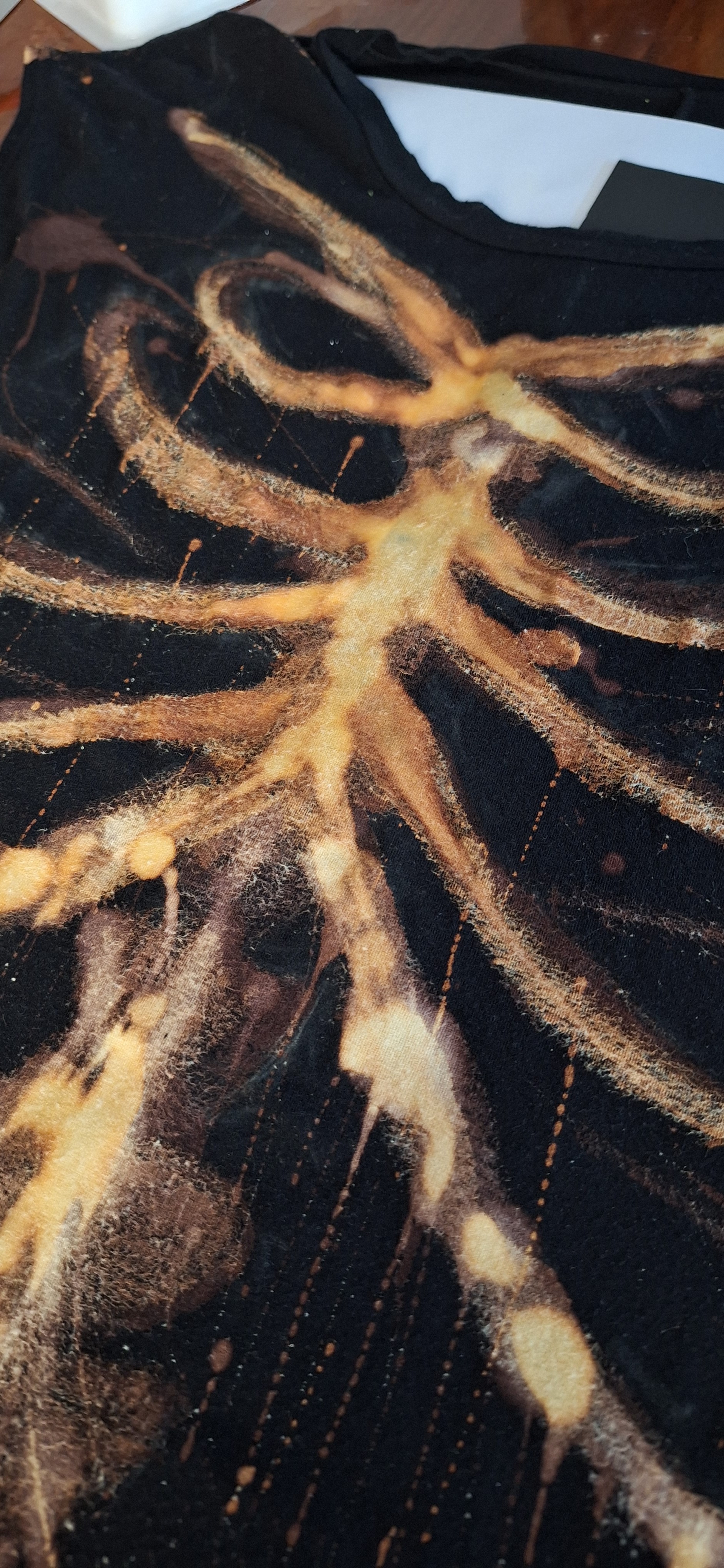 Trabajo sobre prendas negras como si fueran lienzos ocultos. Uso decolorante textil como herramienta de revelación: no agrego color, lo arranco. Cada trazo es una herida precisa que transforma la tela en superficie viva, quemada, vibrante. Estas piezas mezclan lo simbólico con lo visceral, lo ornamental con lo urbano. Me interesa lo que se borra, lo que resiste, lo que permanece. Estampar con lavandina es mi forma de dibujar con el tiempo.
